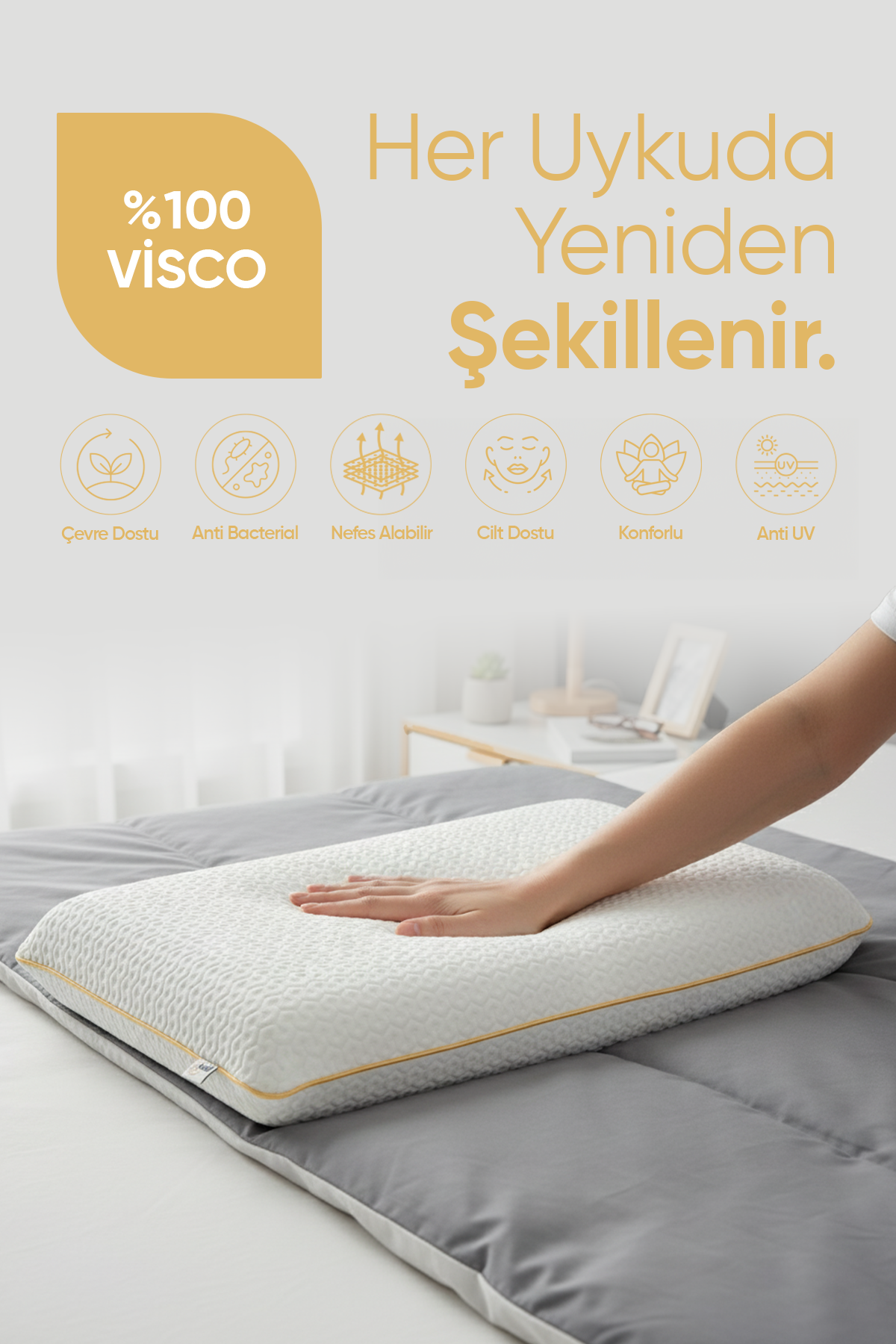 Hafızalı Visco Teknolojisi: Baş ve boyun şeklinize tam uyum sağlayarak basıncı minimize eder.