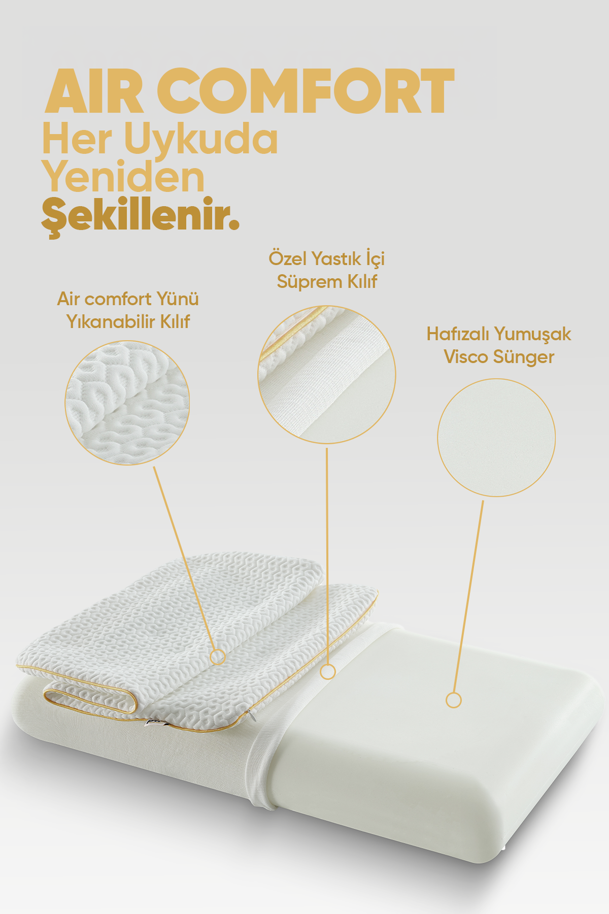 Özetle, Air Comfort Kumaşı, yumuşaklığı, esnekliği ve mükemmel destek sağlayan yapısıyla rahat bir uyku deneyimi sunar. Başınızı ve boynunuzu nazikçe sararak dinlendirici bir uyku ortamı oluşturur. Esnek ve dayanıklı kumaş yapısı, her uyku pozisyonunda maksimum konfor sunar.