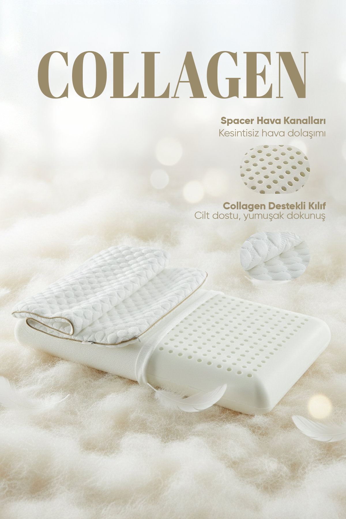 Kollajen ve elastin lifleri içeren Collagen Kumaş Teknolojisi ile tanışın. Cildin nem dengesini koruyarak kurumasını ve incelmesini önleyen bu güzellik yastığı, kırışıklık oluşumunu geciktirirken ipeksi yumuşaklığıyla konforlu bir uyku ortamı yaratır. Boyun fıtığı ve düzleşmesi yaşayanlar için ideal olan özel visco yapısıyla her sabaha tazelenerek uyanın!